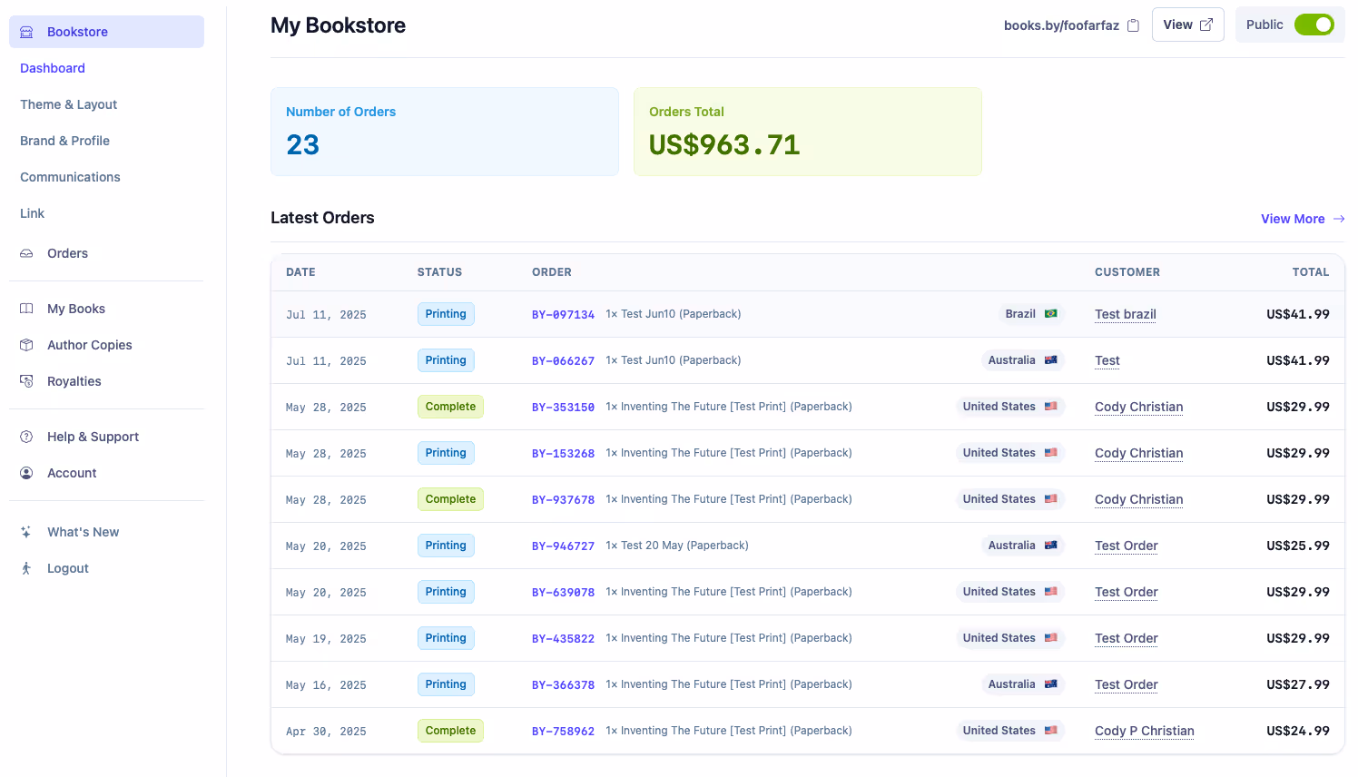 Books.by doesn’t hide sales behind quarterly reports or complicated spreadsheets. Every order is yours to see. Every buyer is yours to know. Every royalty is yours to keep.